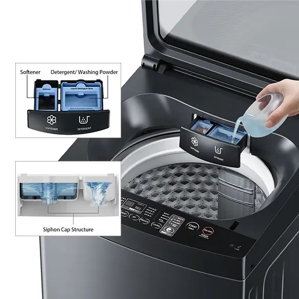 Separate grids for detergent and softener to prevent mixing. Removable dispenser lid for replacing detergent with washing powder.