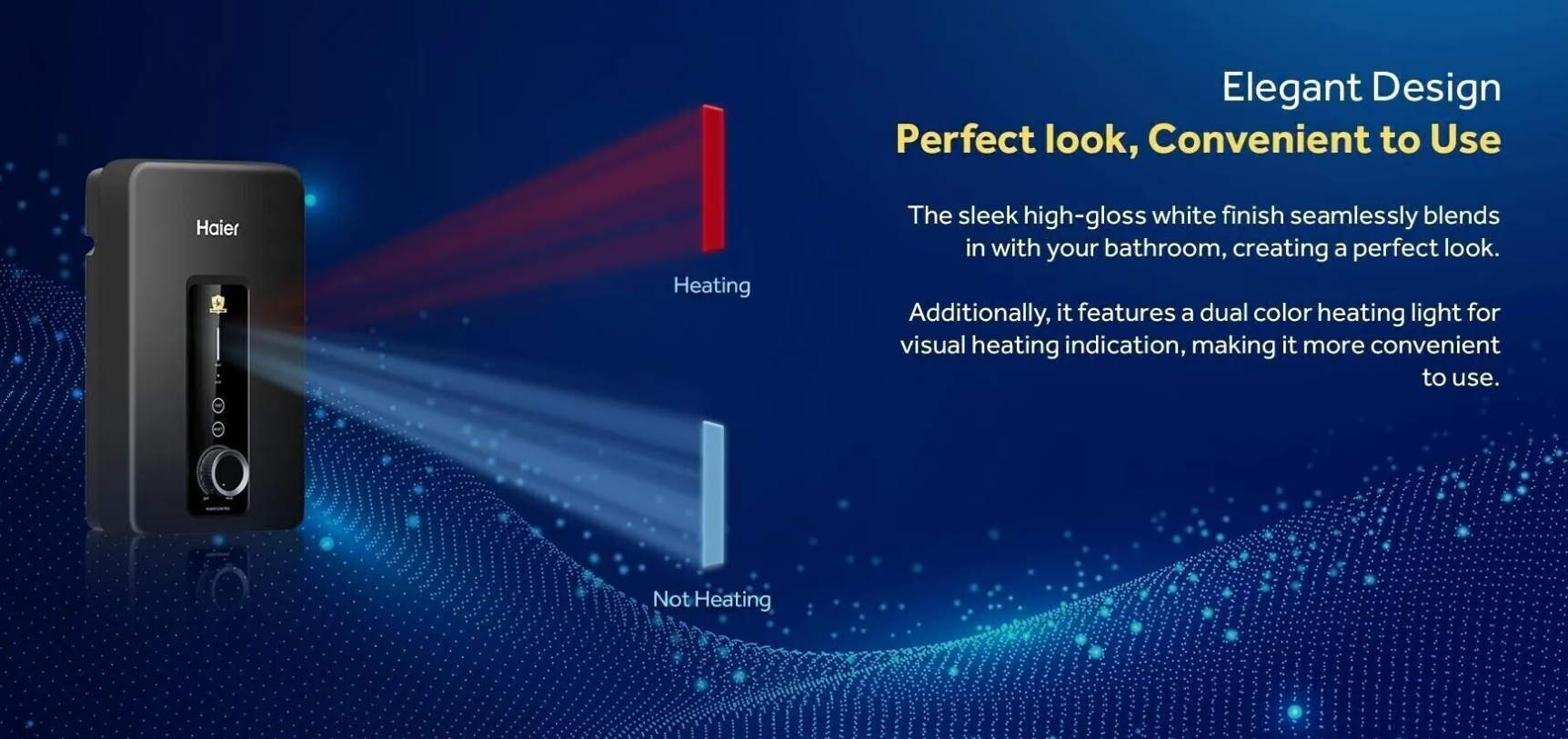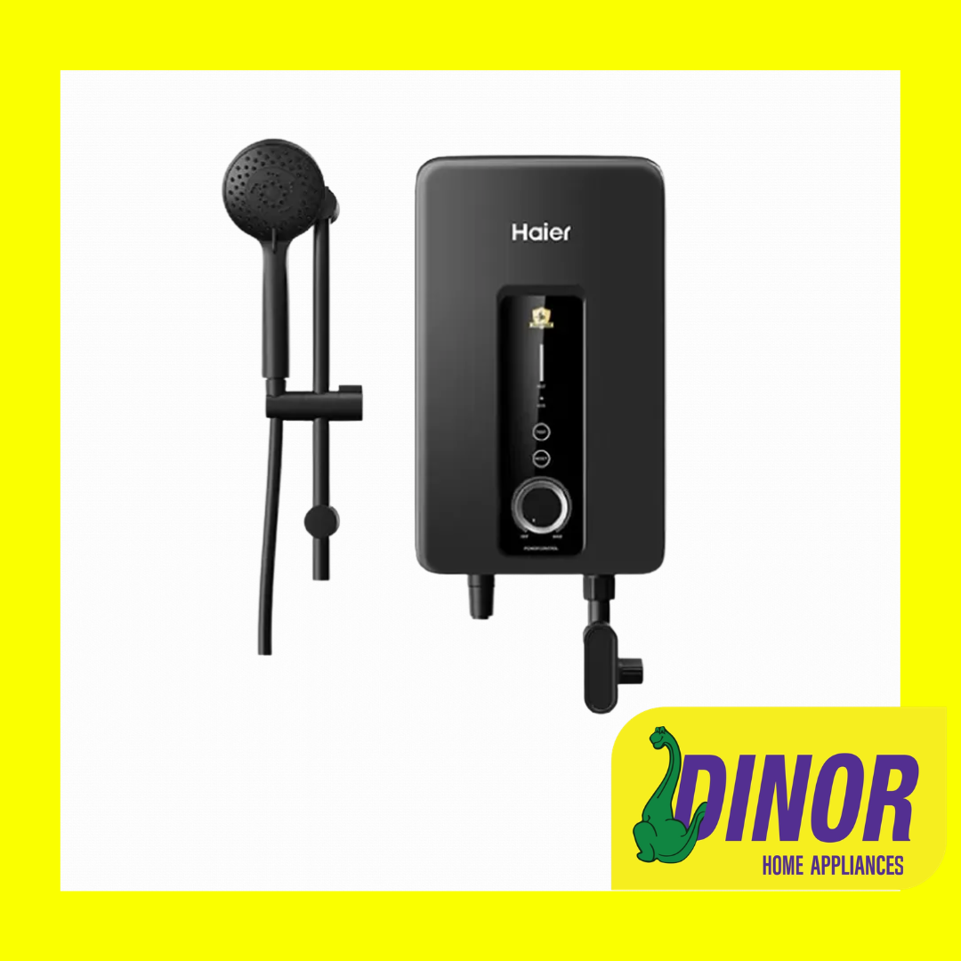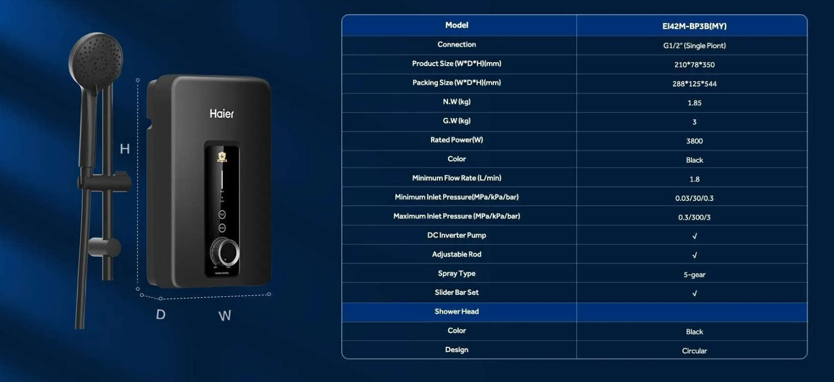 The Haier EI38M-BP3B(MY) is a high-performance instant water heater from the Boxer Series, specifically designed for safety, hygiene, and low-noise operation. It features a sleek matte black finish and is equipped with a powerful booster pump for low-pressure areas.