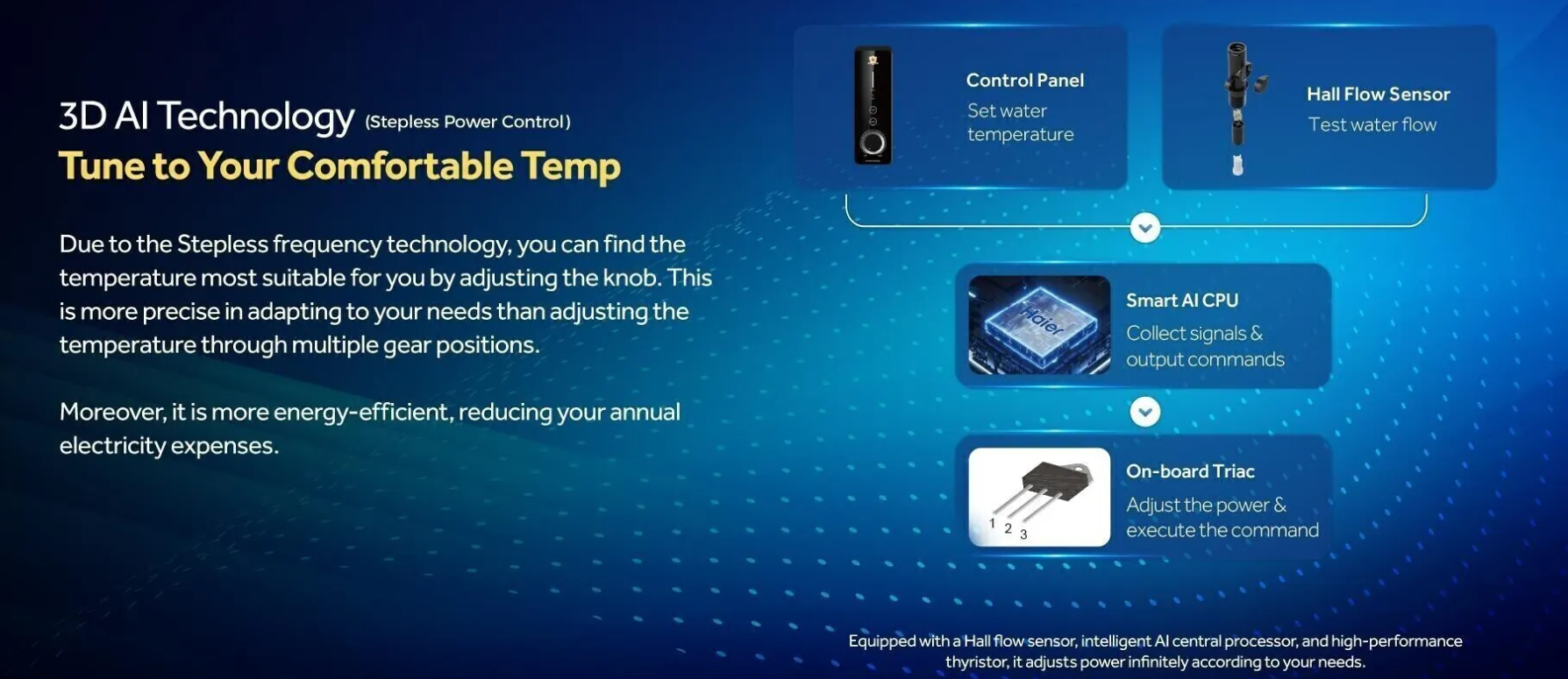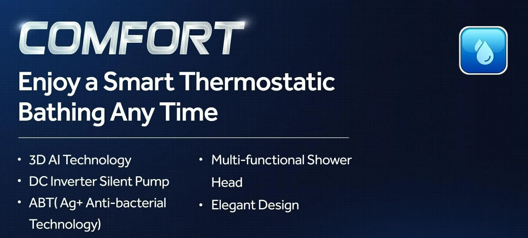 3D AI Technology: An intelligent thermostat system that monitors and maintains a constant water temperature to prevent sudden spikes or drops during your shower.