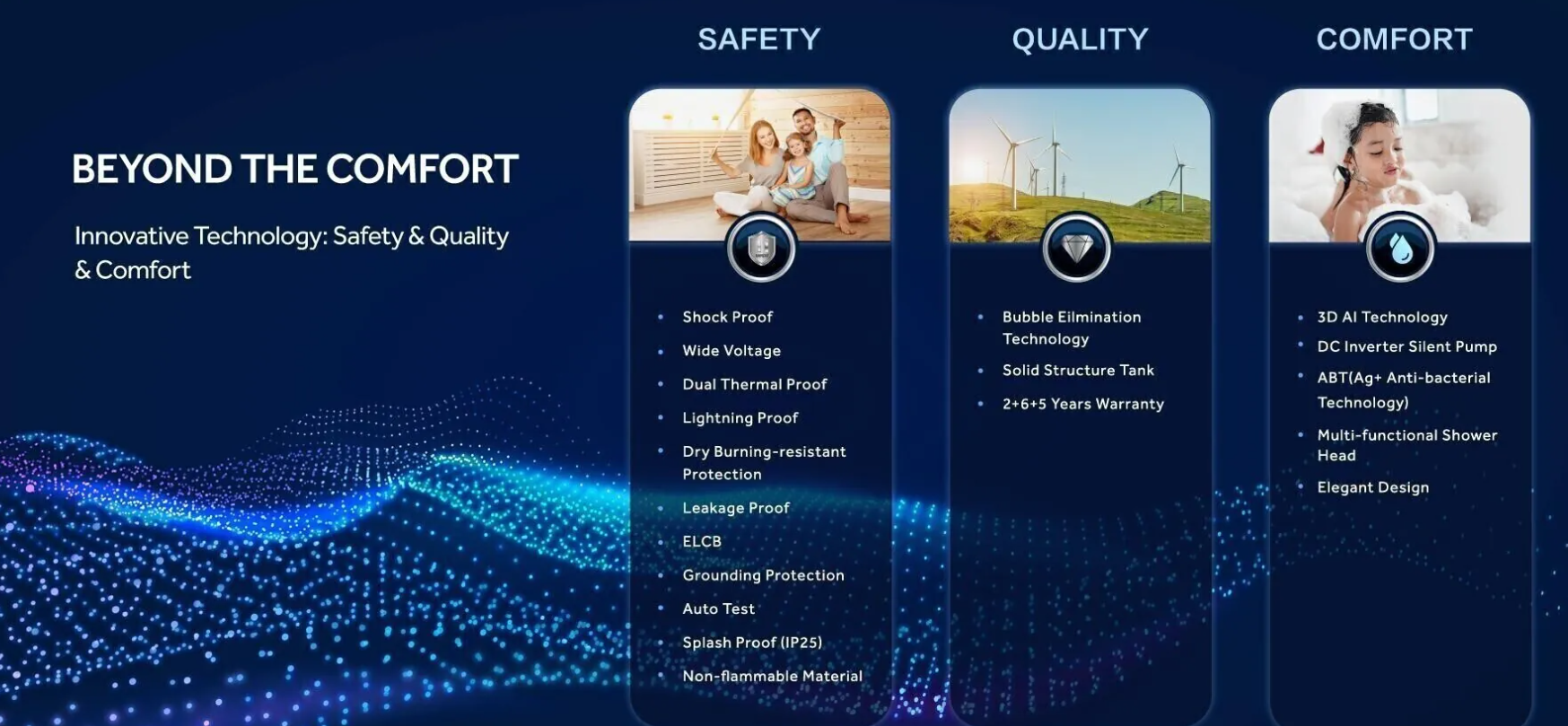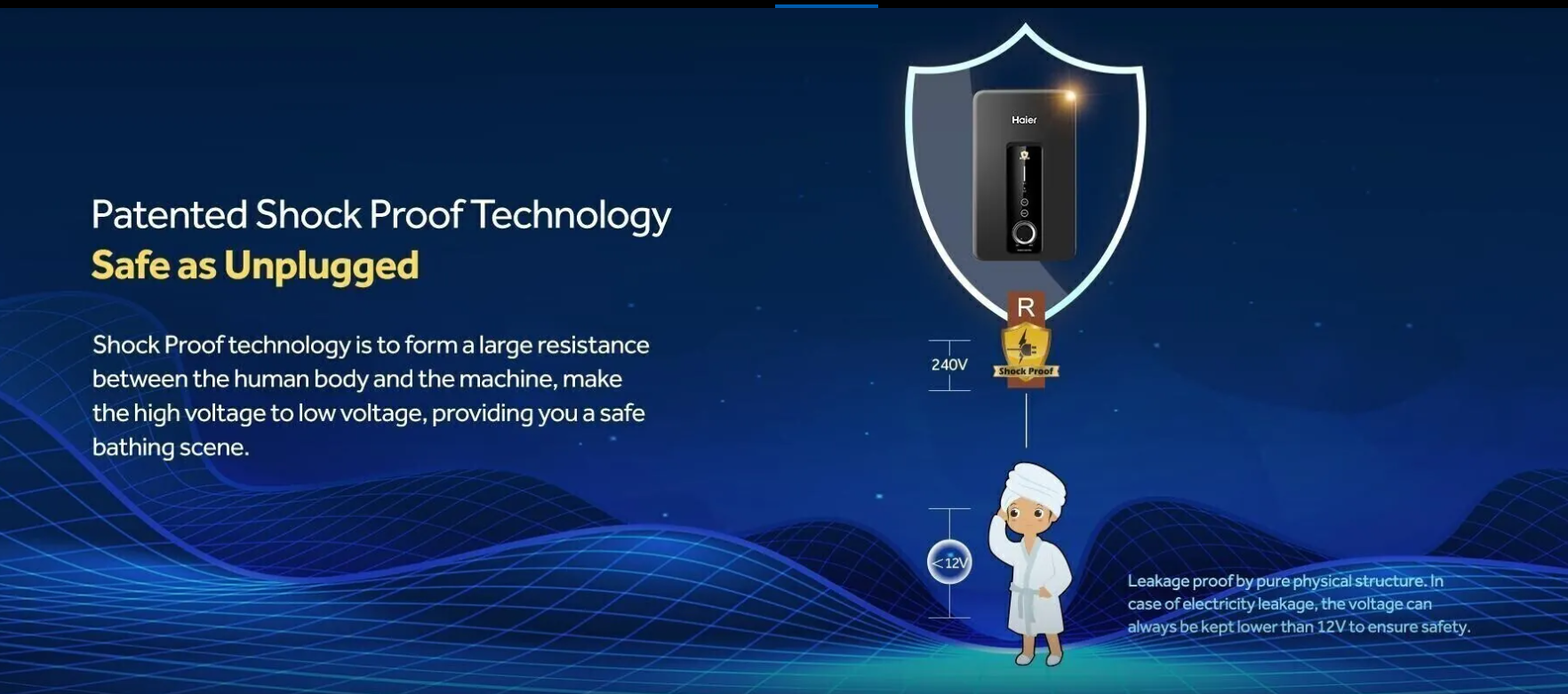 Shock Proof Technology: A patented safety design that prevents electricity leakage, ensuring the unit is safe to use even in the event of an electrical fault.