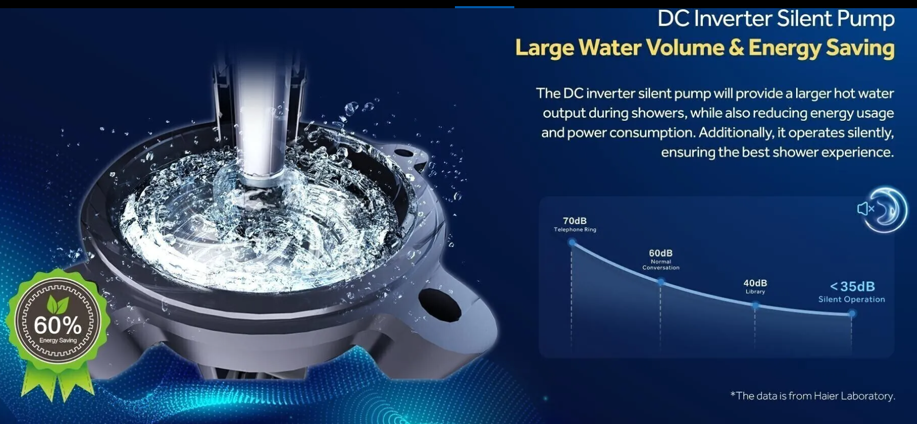 DC Inverter Silent Pump: Provides a strong, consistent water flow while operating at a very low noise level (typically under 40dB).