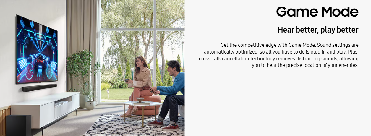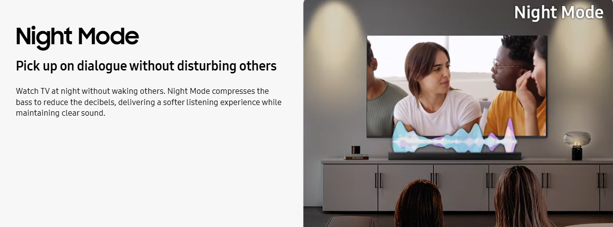 Get the optimal listening experience for each scene. Your soundbar recognizes the type of content you’re watching and automatically adapts audio settings to produce clear voices and detailed sounds.