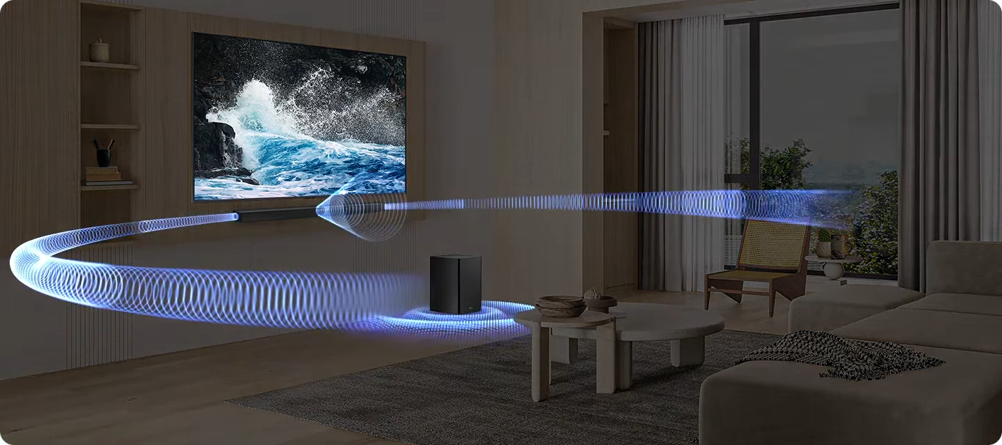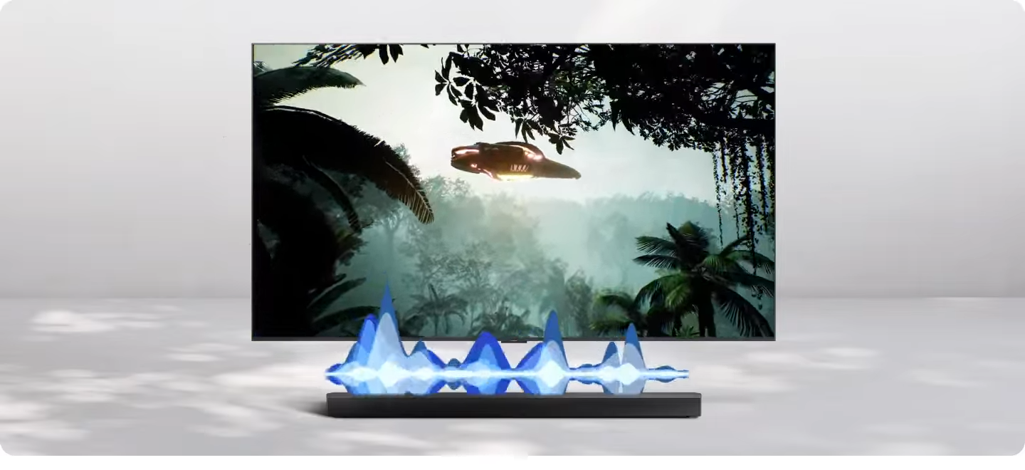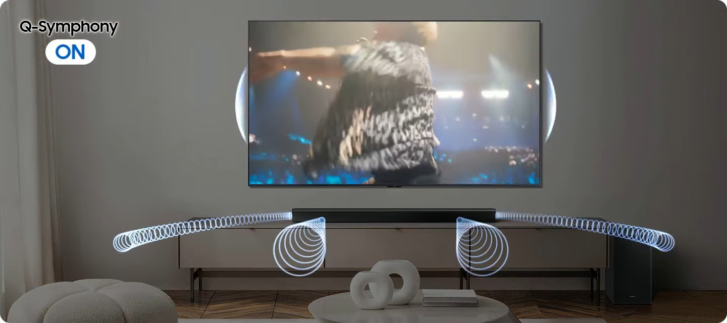 With Q-Symphony, AI separates voice and background sounds for playback through the optimal channel. Now you get crisper dialog and more immersive 3D surround sound, playing through your TV speakers and soundbar in complete synergy.