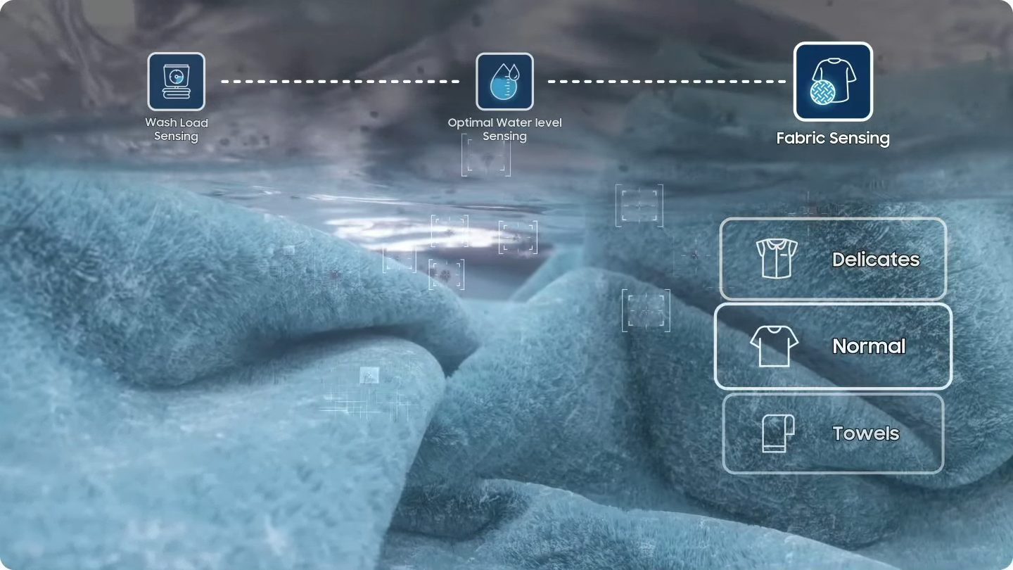 AI Wash: Uses advanced sensors to detect both the weight of the load and the softness of the fabric. An AI algorithm then automatically adjusts water levels, agitation intensity, and wash/rinse times to provide 25% more fabric care.
