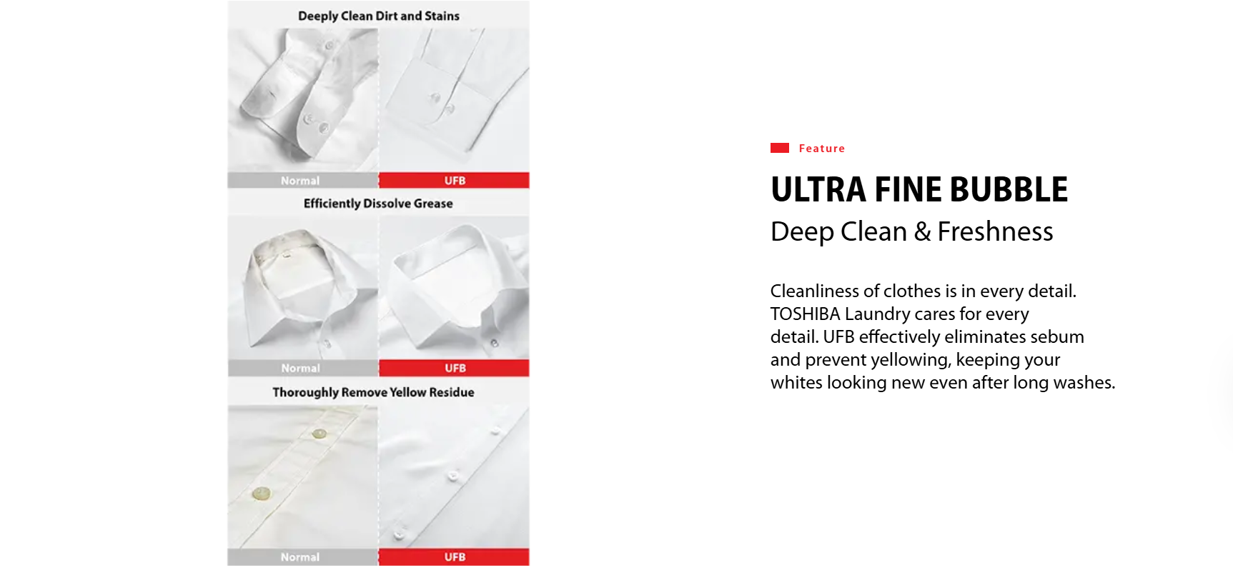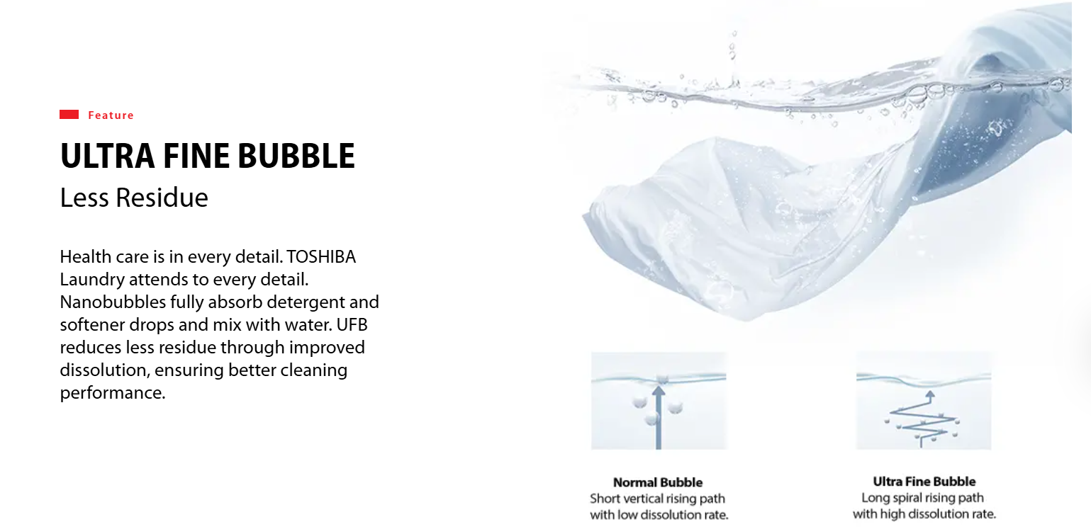 Ultra Fine Bubble (UFB): Generates nano-sized bubbles that are 10–200 times smaller than fabric fibers. These bubbles deliver detergent deep into the weave to remove stubborn sebum, prevent yellowing, and ensure your clothes stay fresh longer.