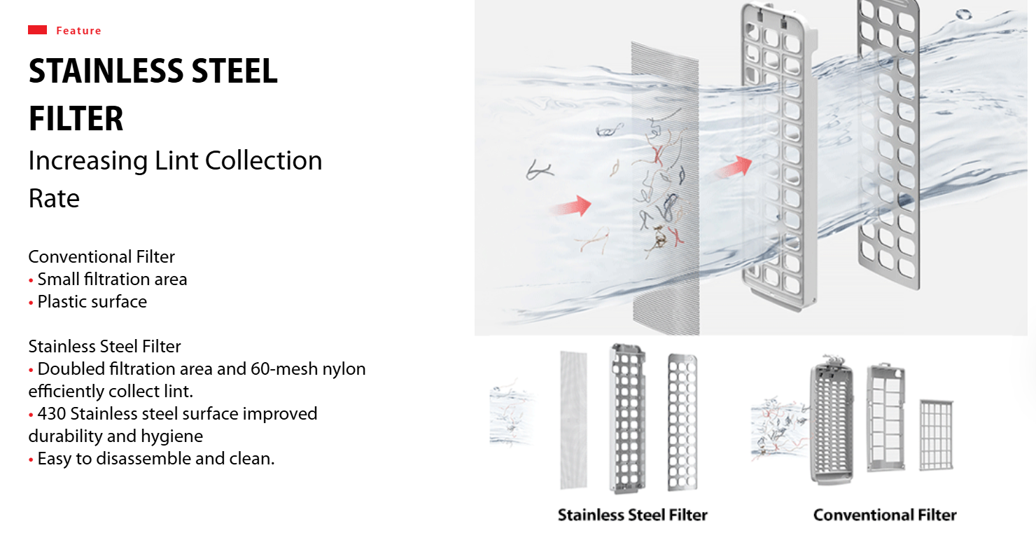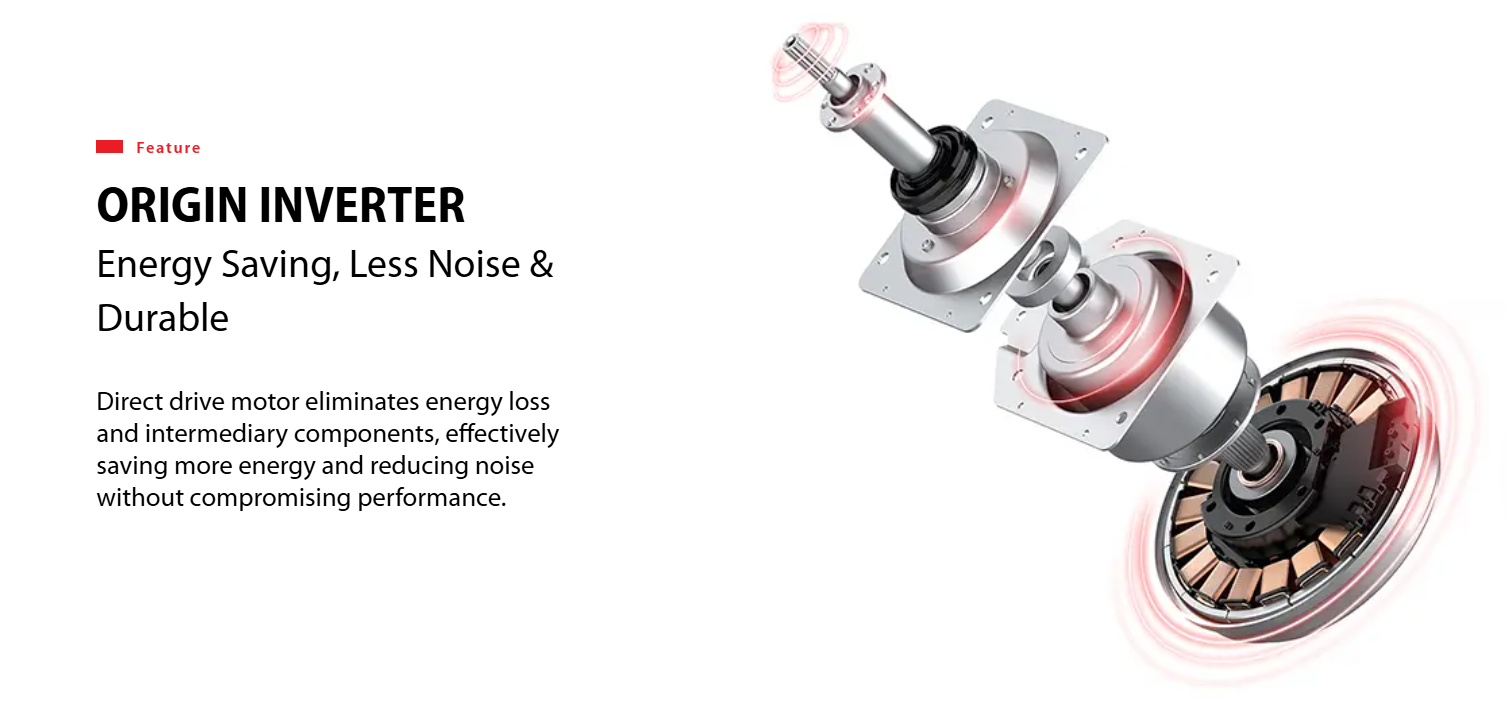 Direct Drive Inverter (DDM): The motor is attached directly to the drum, eliminating belts and pulleys. This results in a machine that is 10% quieter, consumes 67% less energy, and is built to last with a 10-year motor warranty.