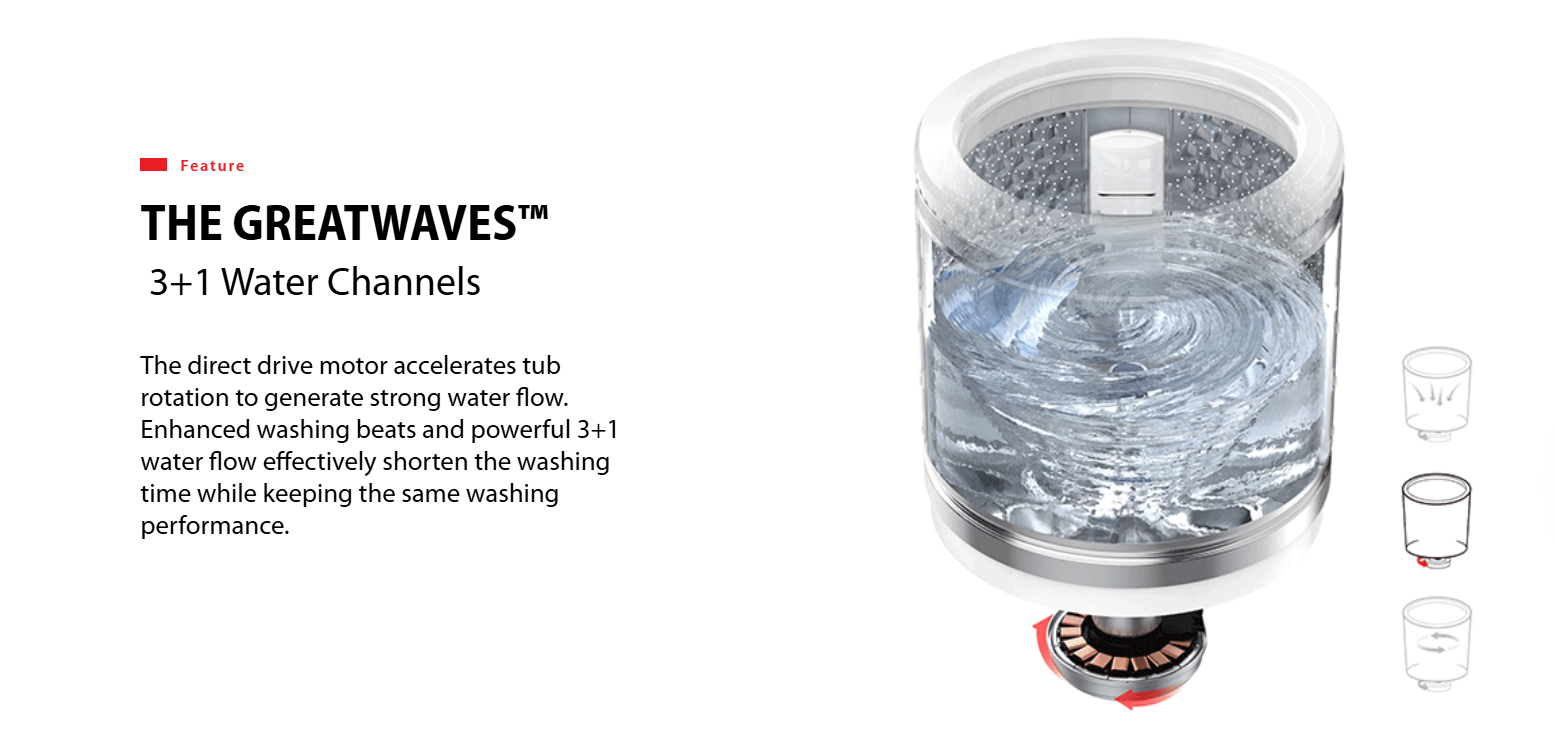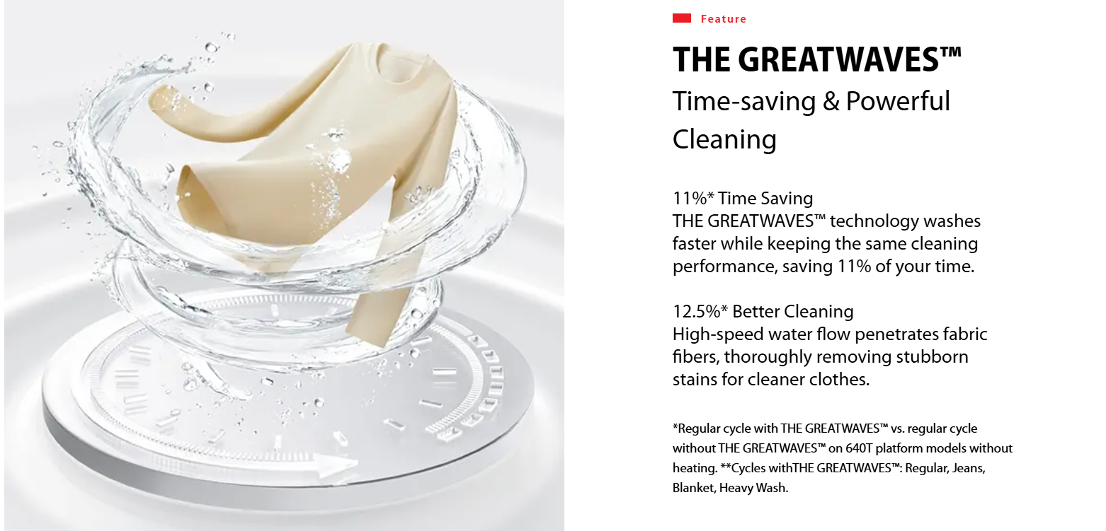 THE GREATWAVES™ Technology: Inspired by Japanese precision, this system uses a unique 3-way water flow (Flush Wave) and a specialized Starring Pulsator to simulate hand-washing. It provides a powerful scrub while protecting the color and texture of your fabrics.