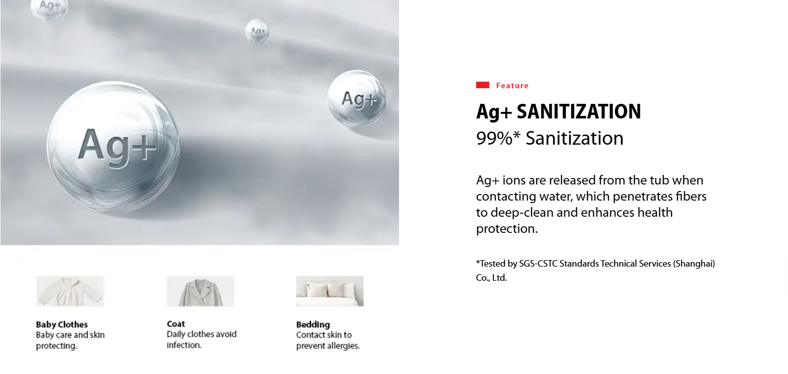 Ag+ Ions: Released during the wash to eliminate 99.9% of bacteria, ensuring a deep hygienic clean.