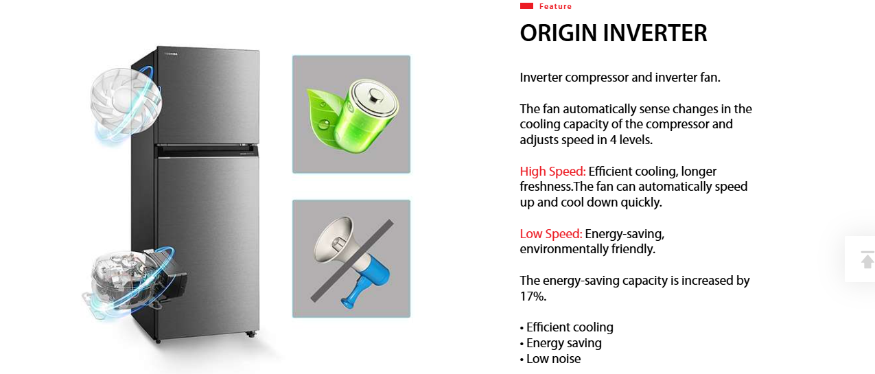 Origin Inverter™ System: Unlike standard single-inverter systems, this model uses an inverter compressor and an inverter fan.3 The fan automatically adjusts between 4 speed levels to match the cooling load, increasing energy efficiency by 17% while maintaining ultra-low noise levels.4