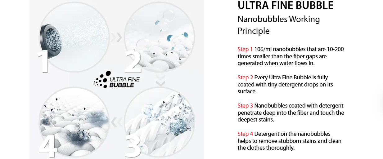 Ultra Fine Bubble (UFB): Generates nano-sized bubbles that are 10–200 times smaller than fabric fibers. These bubbles fully activate detergent to remove deep-seated sebum dirt, preventing the yellowing of whites and removing stubborn stains even in cold water.