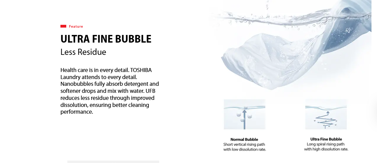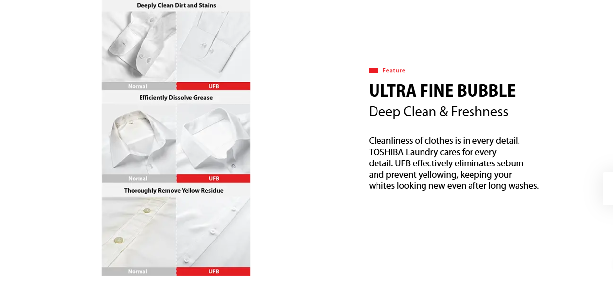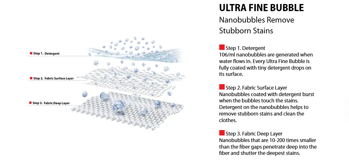 Ultra Fine Bubble (UFB) Technology: Generates millions of nanobubbles that penetrate deep into fabric fibers to dissolve detergent, lift stubborn stains, and remove sebum residue, delivering an exceptionally clean and fresh wash.